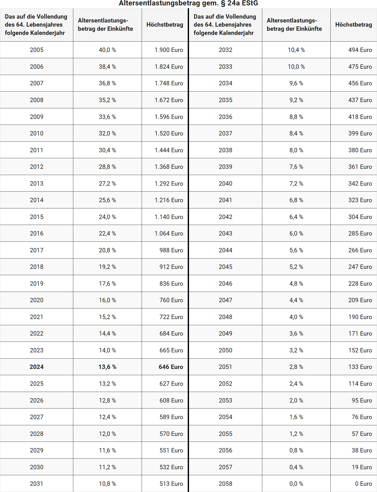 - Geburtsjahr 1959 (vollendetes 64. Lebensjahr in 2023): Ab 2024 beträgt der Altersentlastungsbetrag 13,6 % der Einkünfte, maximal 646 Euro.