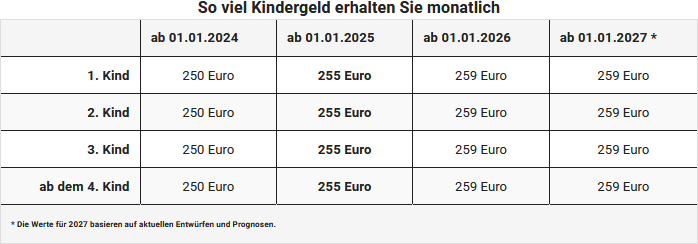 Das Kindergeld wird ab Januar 2025 auf 255 Euro pro Kind erhöht (zuvor: 250 Euro). Die Auszahlung erfolgt unabhängig vom Einkommen. Voraussetzung ist die Angabe der Steuer-ID des Kindes.