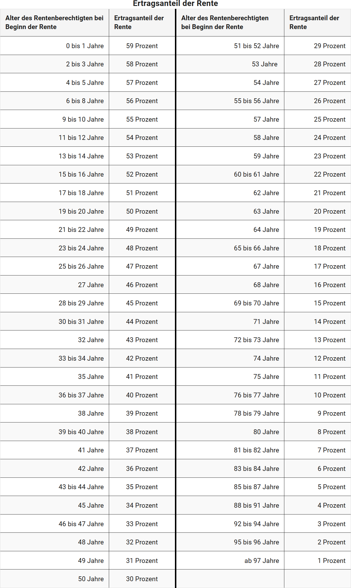 Die Höhe des Ertragsanteils richtet sich nach dem Alter des Rentenberechtigten bei Beginn der Rente (§ 22 Nr. 1 Satz 3 EStG). In der folgenden Übersicht finden Sie die Höhe des Ertragsanteils je nach Alter bei Beginn der Rente: