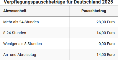 Für Verpflegungsmehraufwendungen können Sie nicht die tatsächlichen Kosten, sondern nur Pauschbeträge absetzen. Die Höhe der Pauschbeträge richtet sich nach der Dauer Ihrer Abwesenheit von Wohnung und Betrieb. Der Verpflegungspauschbetrag beträgt bei Geschäftsreisen innerhalb Deutschlands mit einer Abwesenheitsdauer von